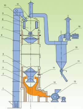 主機(jī)采用立式裝備鋼結(jié)構(gòu)外殼,內(nèi)襯設(shè)保溫材質(zhì)保溫,窯內(nèi)采用多層高溫鑄件,相互交叉重疊,上、中、下各有關(guān)部件設(shè)若干組振動(dòng)、截流、溫控、智能控制系統(tǒng),水蒸氣、煙氣經(jīng)引風(fēng)機(jī)旋風(fēng)式收塵器收塵排除。